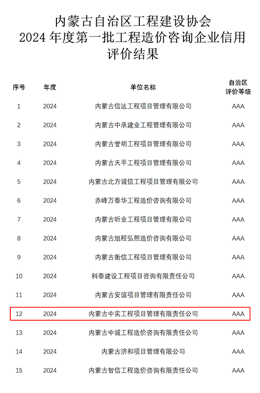 2024-07-3014958 次近期,我公司参加内蒙古自治区工程建设协会组织的“2024年度第一批工程造价咨询企业信用”申报,获得“信用AAA级证书”。我公司成立多年以来,遵循中国工程造价管理协会对造价咨询企…